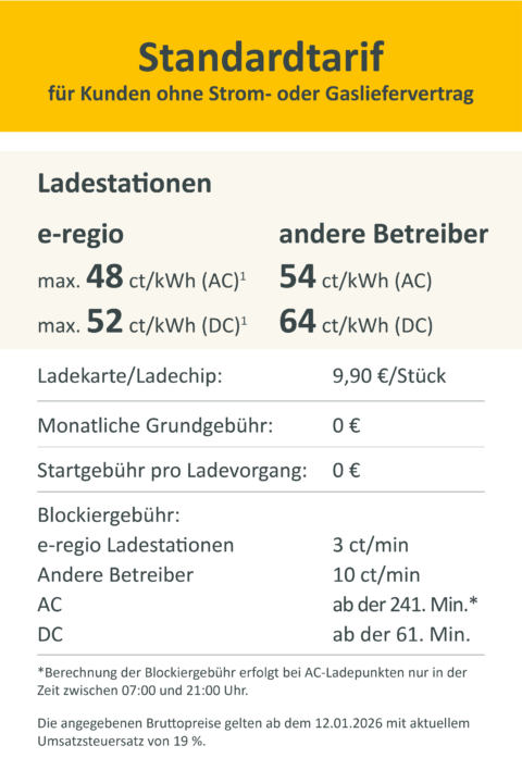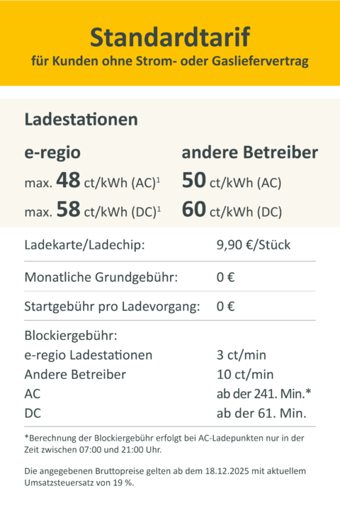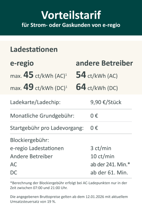 Zur Nutzung des Standardtarifs und des Vorteilstarifs ist die Registrierung in der e-regio LadeApp (vormals TankE-Netzwerk-App) erforderlich.