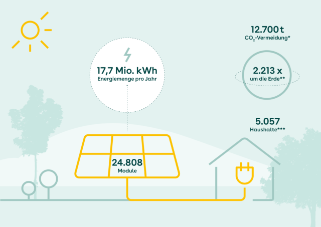 Auf einer Fläche von ca. 13,5 Hektar sollen beide Teilparks ab Mitte 2026 im Jahr etwa 17,7 Mio. Kilowattstunden Strom erzeugen. Das reicht rechnerisch für mehr als 5.000 Haushalte.